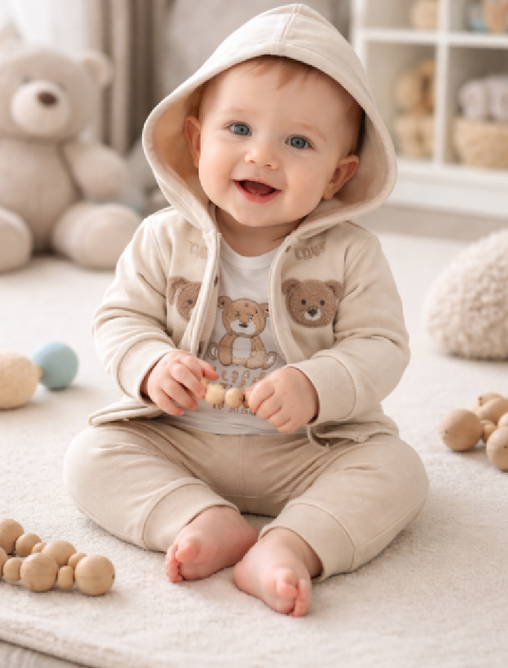 Setul este realizat din bumbac si contine hanoracul, pantalonasii si un body asortat