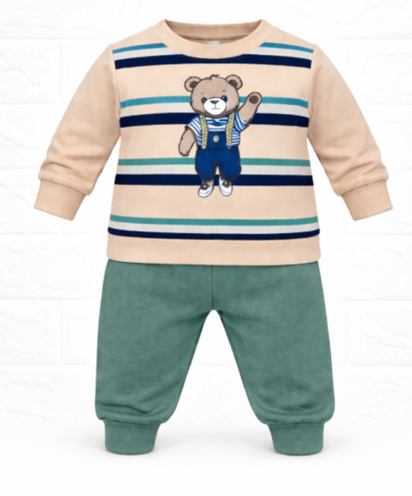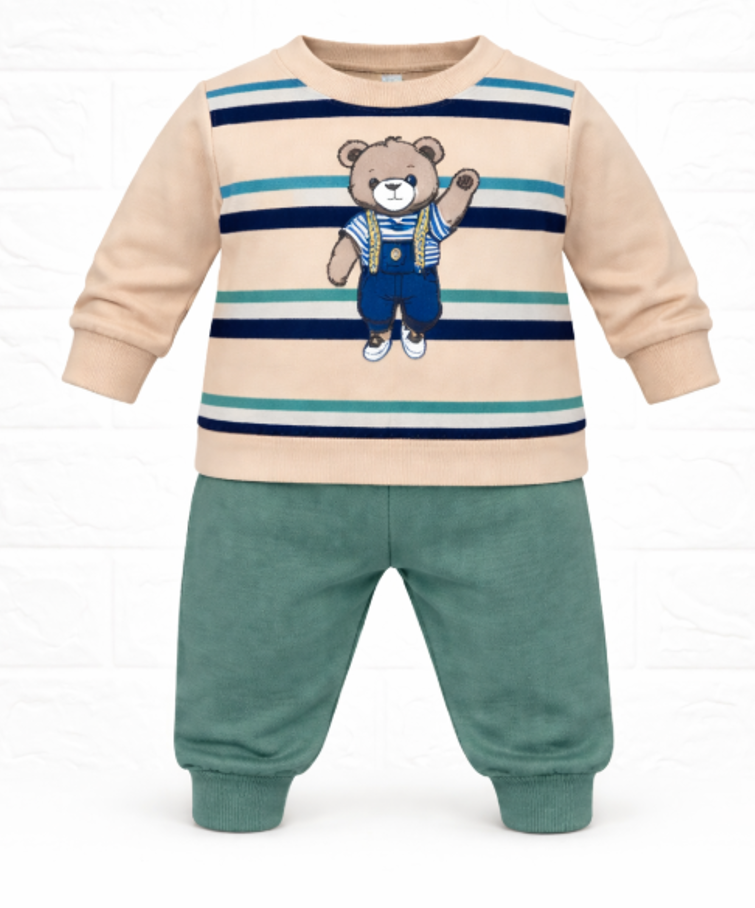 O alegere practică și adorabilă pentru garderoba micuțului tău, acest compleu sport pentru bebeluși combină confortul cu un design jucăuș. Setul este format dintr-o bluziță bej cu imprimeu ursuleț în stil baseball și pantaloni bleu cu talie elastică, ideali pentru mișcare și joacă zilnică.