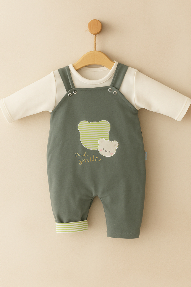 Salopeta este confecționată dintr-un amestec delicat de 80% bumbac și 20% poliester, oferind un echilibru perfect între confort și durabilitate. Bumbacul moale asigură o senzație plăcută la atingere, în timp ce poliesterul contribuie la rezistența și menținerea formei salopetei, chiar și după multiple spălări. Mai mult, materialele utilizate sunt fără substanțe alergene, protejând pielea sensibilă a bebelușului de iritații și alergii.