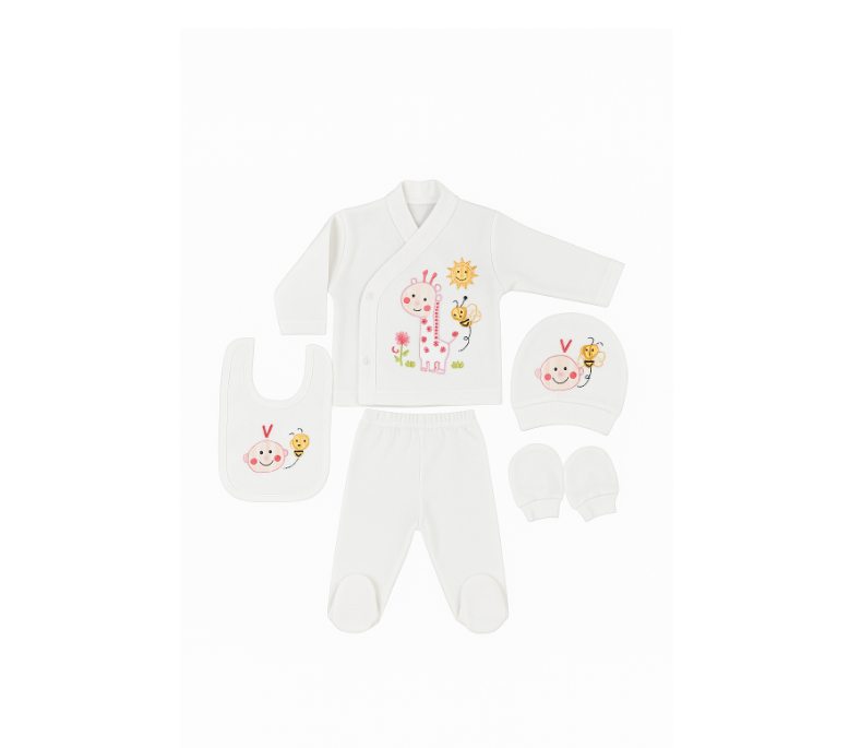 Compleu 5 piese, 0-3 luni, model animalute vesele, alb roz