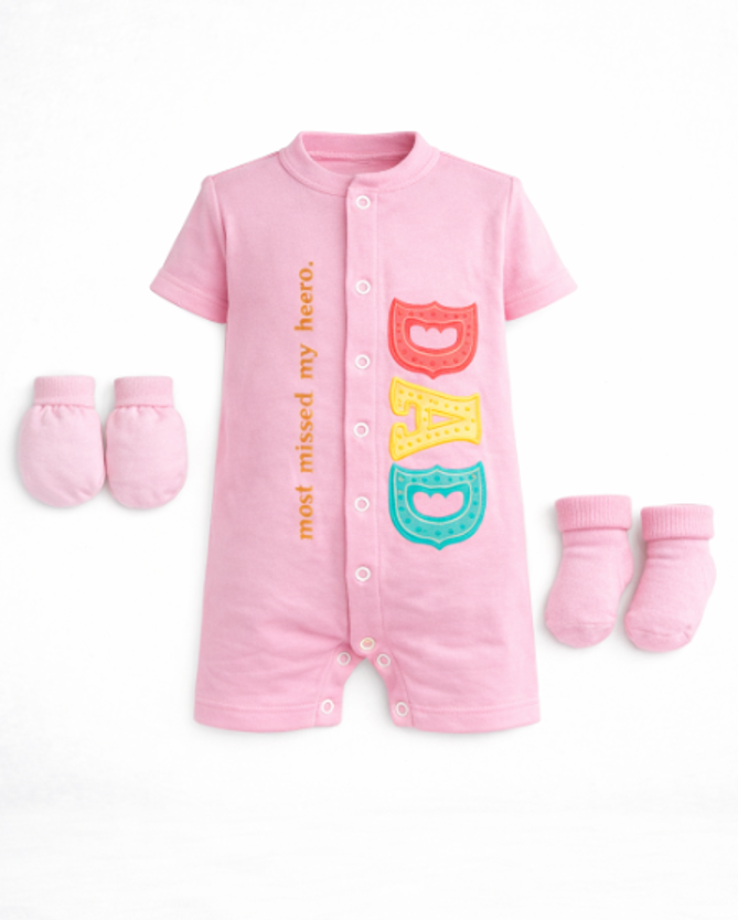 Setul include salopetă, mănuși și șosete asortate, oferind un outfit complet pentru nou-născuți și bebeluși. Materialul din bumbac moale este sigur pentru pielea delicată și rezistent la spălări repetate, păstrându-și forma și culoarea.
