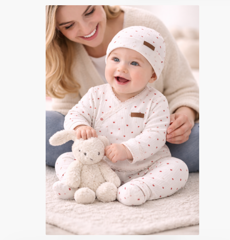 Alege un set pentru nou-născuți din 3 piese, realizat din bumbac rib moale, cu imprimeu delicat cu inimioare roșii, perfect pentru ținute de zi cu zi sau pentru un cadou special. Designul minimalist, fără dantelă, oferă un aspect modern și curat, ideal pentru fotografii de produs sau purtare zilnică.