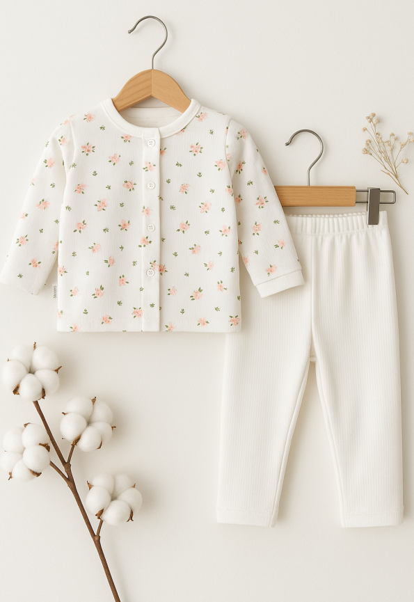 Setul este confecționat integral din bumbac 100% pieptănat, un material incredibil de moale și delicat cu pielea bebelușului. Bumbacul pieptănat este superior bumbacului obișnuit, deoarece este mai fin, mai rezistent și mai puțin predispus la scame, asigurând un confort sporit și o durabilitate remarcabilă.