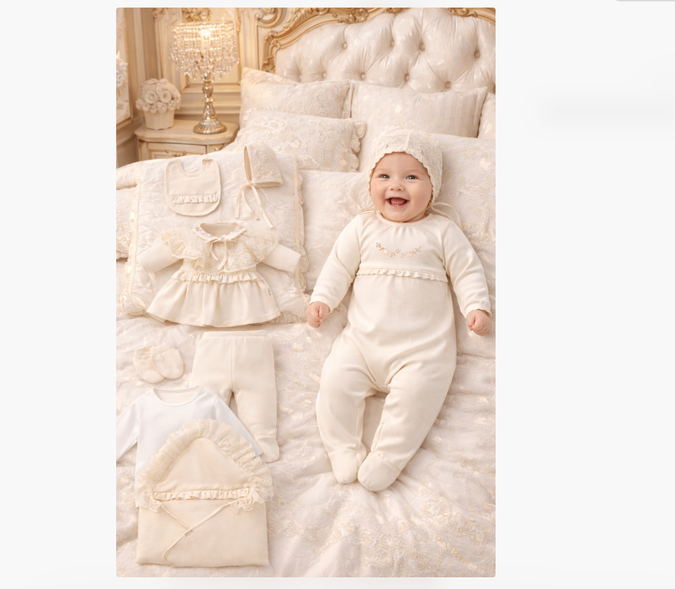 Produsele sunt realizate din materiale moi, de calitate superioară, prietenoase cu pielea sensibilă a bebelușului. În jurul micuței sunt aranjate armonios celelalte piese din colecție: rochiță cu detalii din dantelă, pantalonași, body, bavețică și port-bebe elegant, creând o imagine completă, perfectă pentru promovare online sau catalog.
