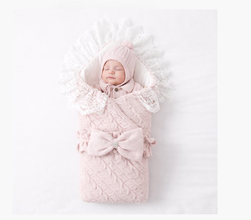 • Portbebe / plic pentru nou-născut, cu dantelă fină și fundă decorativă, ideal pentru înfășat