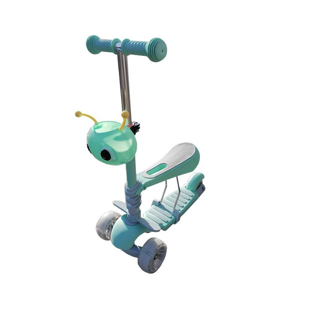 rotineta Omida este proiectata cu un design sofisticat cu trei roti si scaunel, in culori placute pastelate.